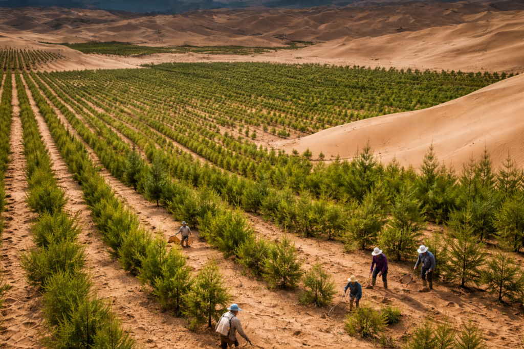 Στα χαρτιά, το αποτέλεσμα ήταν εντυπωσιακό: δάση εκεί που υπήρχε άμμος. Δορυφορικές εικόνες που έδειχναν πράσινες λωρίδες να καταπίνουν την έρημο. Ένα success story έτοιμο για εξαγωγή.